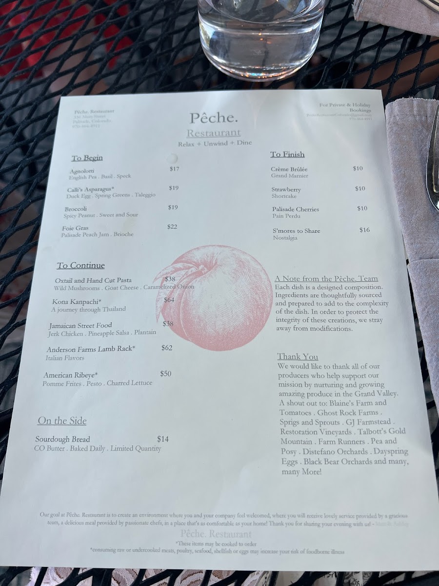 Welcome to Pêche. Restaurant, a culinary gem nestled in Palisade, Colorado, offering a true fine dining experience. The menu highlights the passion and expertise of the chefs, featuring exquisite dishes that tantalize the senses.